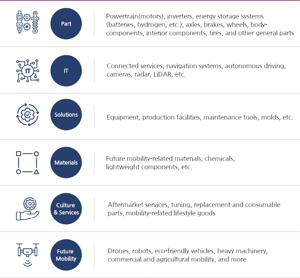 Powertrain(motors), inverters, energy storage systems(batteries, hydrogen, etc.), axles, brakes, wheels, body components, interior components, tires, and other general parts